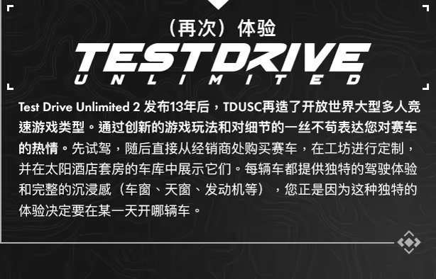 体验 TEST DRIVE UNLIMITED。随着 Test Drive Unlimited 2 释出后 13 年,TDUSC 重新开发了开放世界、可大量多人游玩的赛车游戏类型。透过创新的游戏玩法以及极其细致的细节,以表达你对赛车的热情。尽情试驾,然后直接向经销商购买赛车、在工作室自订,接着在太阳酒店套房的车库展示。每辆赛车可给予独特的驾驶体验,以及完整的沉浸感(车窗、天窗、引擎等),而这个专属的体验可让你决定在特定日子选择特定的赛车。