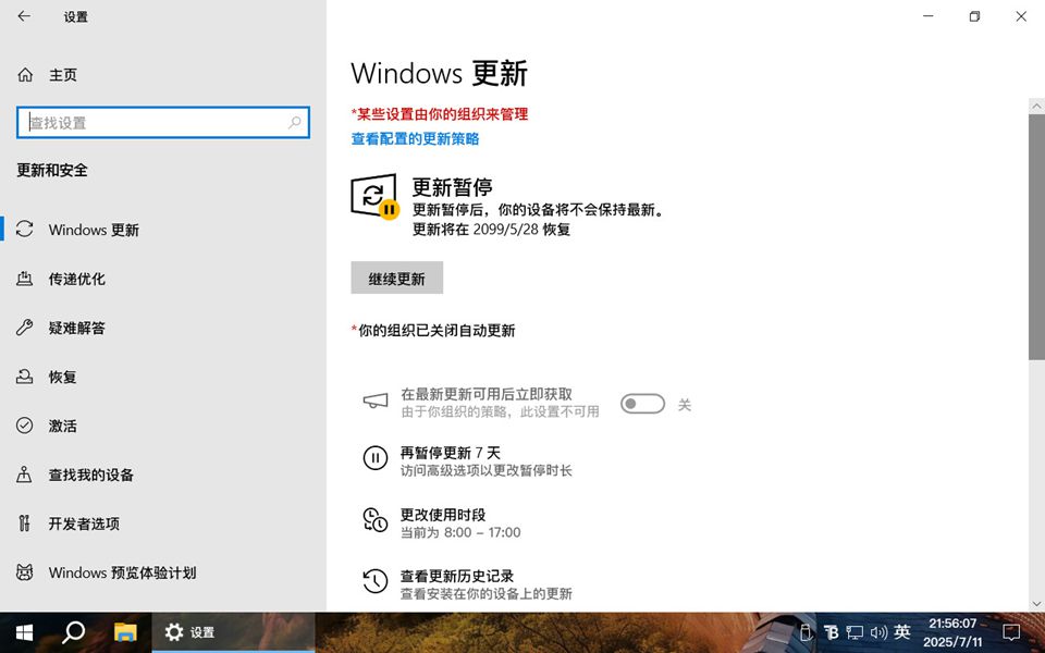 防止自动更新补丁,设置Windows Update暂停更新到2099年5月28日。
