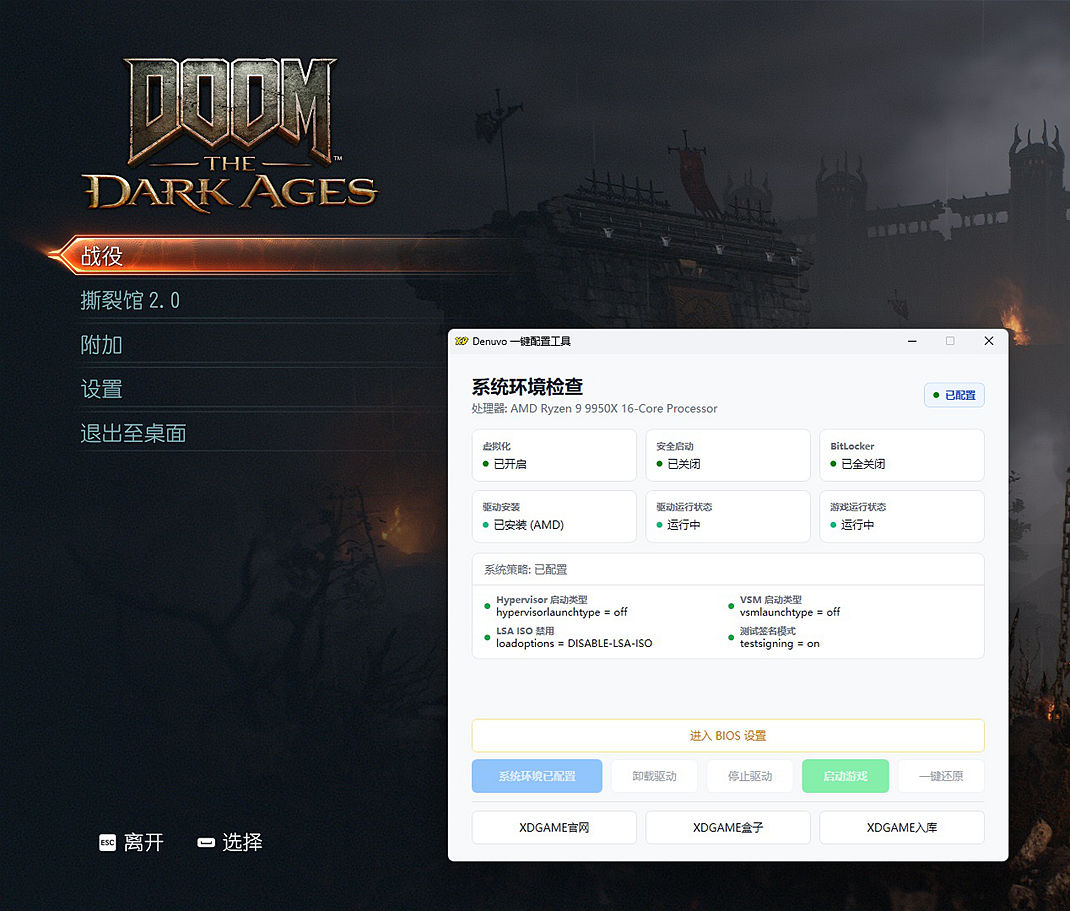 重启电脑后继续打开Denuvo.exe点击 安装驱动 → 启动驱动 → 启动游戏 → 开始玩耍